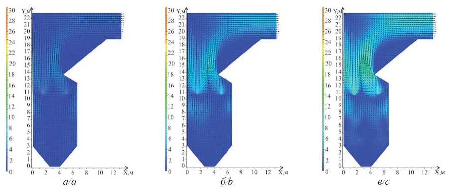 Рис. 3. Распределение скоростей (м/с) в продольном сечении топочной камеры с соплами третичного дутья: а) нагрузка 50 %; б) нагрузка 80 %; в) нагрузка 100 %