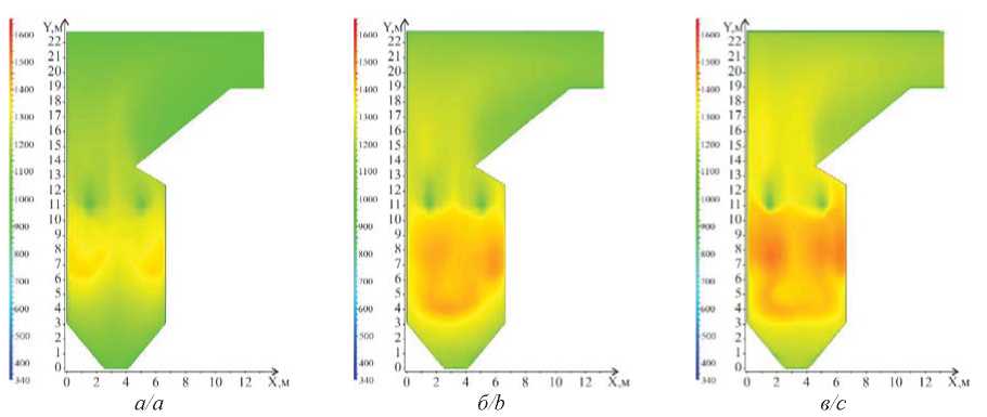 Рис. 5. Распределение температуры (К) в продольном сечении топочной камеры: а) нагрузка 50 %; б) нагрузка 80 %; в) нагрузка 100 %