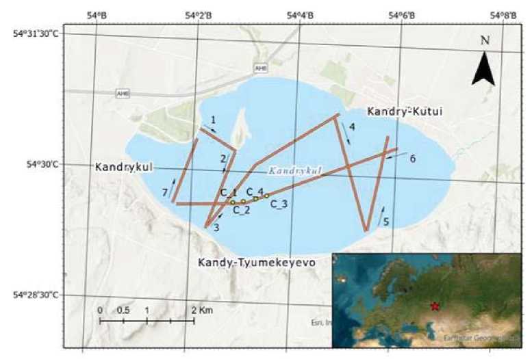 Рис. 1. Расположение озера Кандрыкуль. Красной линией показаны сейсмоакустические профили, красными точками отмечены места отбора керна