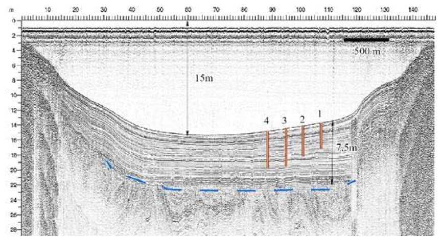 Рис. 2. Сейсмоакустический профиль #6. Синей пунктирной линией отмечено время образования озерного бассейна. Красной линией изображены керновые колонки