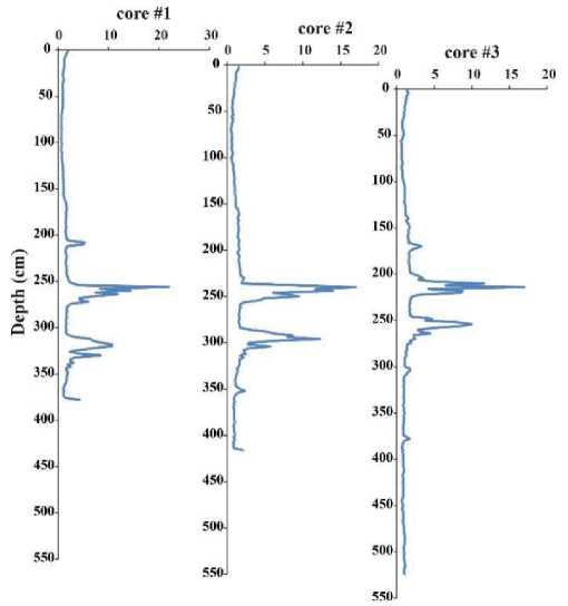 Fig. 3 presents the results of MS measurements. MS values vary in the ranges of (0.56–21.94)*10–7 m3/kg, (0.54–16.98)*10–7 m3/kg, and (0.58–16.94)*10–7 m3/kg for core columns #1, #2, and #3, respectively.