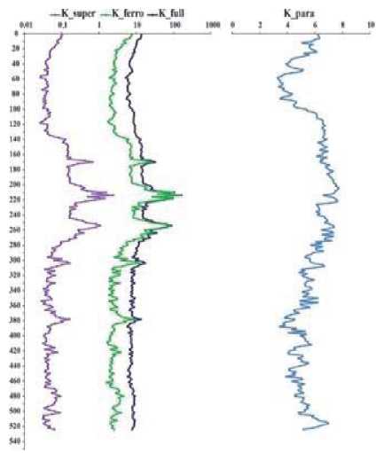 In our case, the analysis was based on k_para and k_ferro, which carry information about various components of the magnetic fraction. These components have different origin, and variations in their content in the sediment carry information about various factors that define the sedimentary environment [23, 24]. An increase in the paramagnetic component indicates an increase in the input of terrigenous material, which means more humid climate [1, 23, 24].