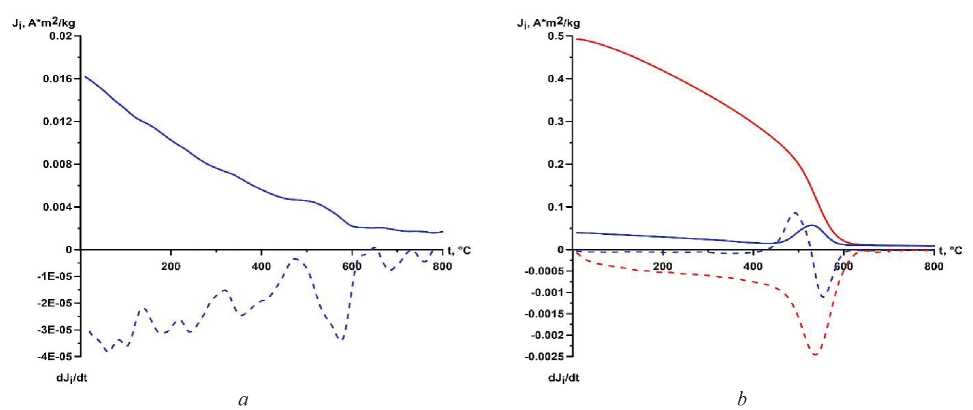 Thermomagnetic analysis is often used for studying the ferromagnetic fraction in rock samples [21, 25]. DTMA of the samples uniformly distributed along the studied section was carried out using a Curie balance. Each sample taken from core column #3 was heated twice in a magnetic field of 0.4 T at a heating rate of 100°C/min. The result was the temperature dependences of the induced magnetization Ji(T) obtained during the first and second heating.