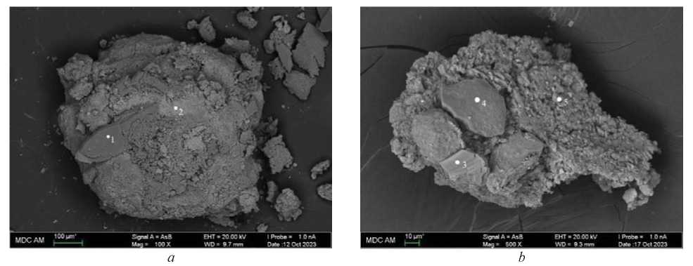 Рис. 7. Электронно-микроскопические снимки образцов 607 (a) и 632 (b) на глубинах 114 и 164 см соответственно. Числа даны в атом. % для элементов, содержание которых превышает 1 %. 1) O – 69,21; Ca – 26,88; S – 15,66; 2) O – 55,16; C – 23,61; Fe – 17,39; S – 2,56; 3) O – 57,57; C – 21,21; S – 8,80; Ca – 7,99; Si – 2,97; 4) C – 60,36; Si – 17,91; O – 16,39; Fe – 2,06; 5) O – 52,02; C – 20,71; Si – 14,32; Al – 5,37; Na – 3,53; Ca – 2,02