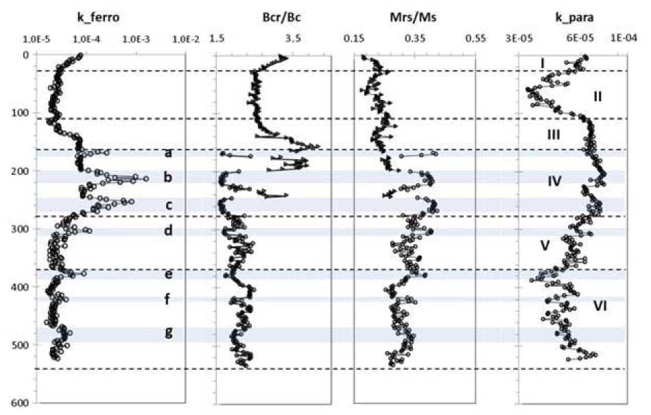 Zone I (0–28 cm) is characterized by an increase in the ferrimagnetic component. The hysteresis parameters imply that this increase is due to MD and SP grains. The paramagnetic component of MS increases as well, which indicates an increase in terrigenous input and water inflow into the basin.