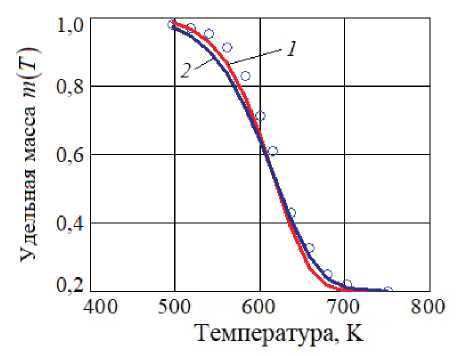 Рис. 7. Температурные зависимости удельной массы пиролизуемой частицы по данным ТГА [29]: 1 – расчетная зависимость mрасч(T) с параметрами A и E (17) [29]; 2 – расчетная зависимость mрасч(T) с параметрами A и E (21), полученными по методу ИГИ; кружки – экспериментальные точки, снятые с кривой ТГА (рис. 4)