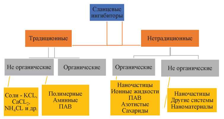 Главная цель указанной части сводится к тому, чтобы представить общую классификацию всех известных типов ингибиторов по имеющимся публикациям и выявить их недостатки. Ранее отмечалось [49, 50], что ингибиторы набухания глин представляют собой материалы или химические вещества, добавляемые в буровые растворы на водной основе для предотвращения гидратации, набухания и разложения глинистых минералов. Жидкости на водной основе более применимы к ингибиторам набухания глин по сравнению с жидкостями на углеводородной основе из-за их меньшего воздействия на окружающую среду, экономической эффективности, анализа коллектора, скорости проникновения и полной безопасности операций [51, 52]. Во время буровых работ было протестировано несколько групп ингибиторов, которые показали отличные эксплуатационные характеристики. На рис. 4 представлена общая классификация доступных ингибиторов набухания глин в открытой литературе (например, [53, 54]).