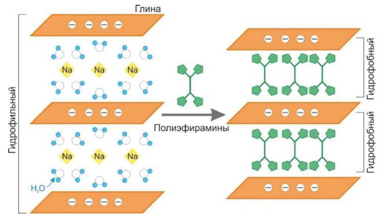 - на основе полимера. Являются дешевыми, экологически чистыми, менее чувствительными к рН, образуют на поверхности глин прочную защитную пленку, которая препятствует проникновению воды.
