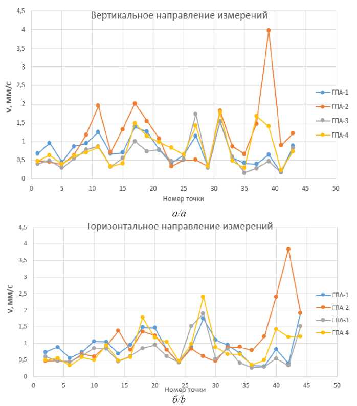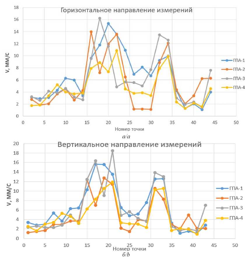 Измерения были выполнены в двух взаимно перпендикулярных направлениях: горизонтальном (нечетные номера) и вертикальном (четные номера), при использовании виброметра SKF Microlog CMXA 70, датчик типа CMSS2200. В цеху расположены 4 ЭГПА. Во время проведения исследования два ЭГПА были в эксплуатации (1, 3), а второй и четвертый агрегат были запущены позже. Эксплуатационные режимы во время проведения замеров представлены в табл. 1.