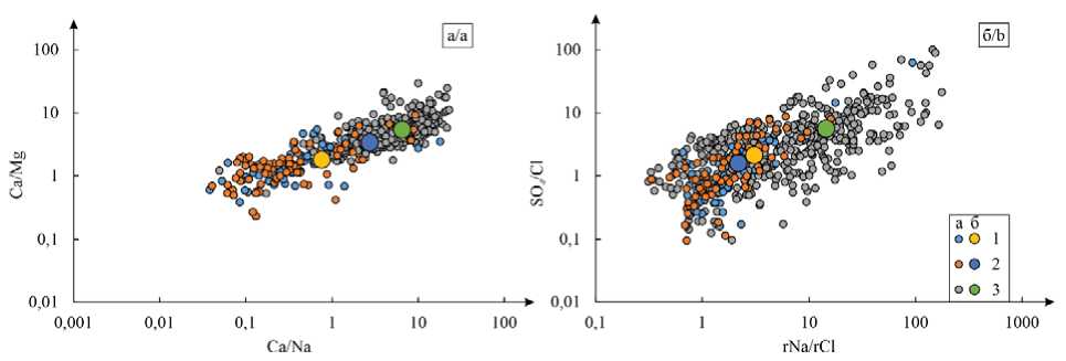 Рис. 3. Геохимическая типизация природных вод по коэффициентам Ca/Mg–Ca/Na (а), SO4/Cl–rNa/rCl (б); 1 – подземные воды Шынгыс-Кокшетауского бассейна (а) и среднее по ним (б); 2 – подземные воды Тениз-Коргалжынского бассейна (а) и среднее по ним (б); 3 – подземные воды Обь-Зайсанской складчатой области (а) и среднее по ним (б)