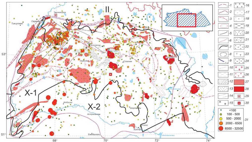 Рис. 4. Радиоэкологическкя карта Северного Казахстана. Контуры палеозойских металлогенических подразделений: 1 – металлогенический пояс с потенциальной ураноносностью; 2 – урановорудные провинции; 3 – урановорудные и редкометально-уран-ториевые структурно-металлогенические зоны; 4 – урановорудные районы; Разрывные нарушения: 5 – установленные 1 порядка; 6 – разрывные нарушения – каналы поступления радионуклидов; 7 – границы гидрогеологических подразделений: II – Западно-Сибирский регион; X-1 – Шынгыс-Кокшетаусский бассейн; X-2 – Тениз-Коргалжинский бассейн; 8 – контуры геологических формаций; Границы выклинивания ЗПО: 9 – области распространения торийсодержащих редкоземельно-титановых россыпей; 10 – кремнисто-углеродистые сланцы; Литологические типы пород с повышенным радиационным фоном: Осадочные – 11 – угленосные; 12 – песчанистые; 13 – песчано-гравелитовые; 14 – кремнисто-углеродистые сланцы, углеродистые песчаники; Интрузивные – 15 – аляскитовые граниты; 16 – нормальные граниты; 17 – гранодиориты; 18 – диориты; 19 – гранитизированные метаморфиты; Вулканогенные: 20 – риолиты; 21 – туфы риолитов; 22 – дациты; 23 – трахиты; 24 – андезиты; Специализированные на уран и торий горные породы U>>10 г/т, Th>>35 г/т: 25 – аляскиты; 26 – граниты; Поля распространения геологических формаций с высокими содержаниями урана и тория: 27 – U – 5–10 г/т; Th – 10–35 г/т; 28 –U>10 г/т; Th>35 г/т; В мезозойско-кайнозойских отложениях – 29 – экзодиагенетические урановые проявления в сероцветных отложениях палеодолин; 30 – то же в существенно глинистых аллювиально-озерных отложениях; 31 – содержание урана в пробе воды, мкг/дм3