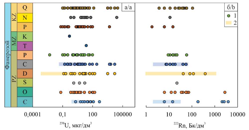 Схожими условиями строения с изучаемой территорией исследования обладает ОЗСО, расположенная в граничных районах Российской Федерации (рис. 1). Здесь распространены гранитоидные массивы пермо-триасового возраста, оказывающие большое влияние на радиоэкологическое состояние региона. Для сравнения их особенностей были выбраны подземные воды водоносных комплексов кембрийского, девонского, каменноугольного возрастов и вод, развитых в пределах гранитных комплексов. Установлено, что содержания 238U в подземных водах ОЗСО изменяются от 0,0007 до 200 мкг/дм3 в девонских комплексах, в каменноугольном от 0,05 до 13 мкг/дм3, в кембрийском до 5 мкг/дм3 и в гранитных образованиях от 0,005 до 348 мкг/дм3 (рис. 5, а). Активность 222Rn в подземных водах в ОЗСО может достигать 43763 Бк/дм3 [22]. В водах девонских отложений активность радона варьирует от 1 до 1161 Бк/дм3, в каменноугольных – от 2 до 68 Бк/дм3, кембрийских – 2–32 Бк/дм3 и гранитных массивах от 1 до 597 Бк/дм3 (рис. 5, б). Таким образом, установлено, что концентрации урана-238 в подземных водах ОЗСО ниже или совпадают с концентрациями в пределах изучаемой территории, при этом активность радона-222 в водоносных комплексах девонского возраста ОЗСО может превышать на порядки таковую в регионе исследования, что связано с наличием в пределах ОЗСО разломной тектоники, а также туфов, туфоконгломератов и глинистых сланцев в составе буготакской и тогучинской нерасчлененных свит девонского возраста.