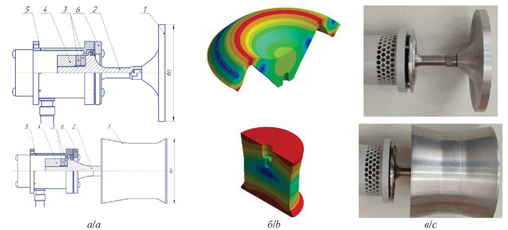 Рис. 3. Эскиз УЗ-излучателя с изгибно-колеблющимся диском (а), форма колебаний (б) и фото УЗ-излучателя (в): 1 – излучающий элемент (диск или цилиндр); 2 – концентратор пьезопреобразователя (излучающая накладка); 3 – пьезокерамические элементы; 4 – отражающая накладка; 5 – корпус; 6 – фланец