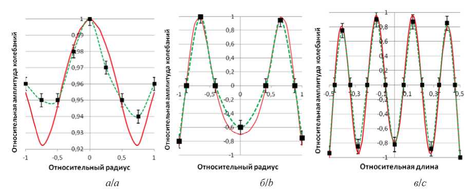 Рис. 4. Распределения относительных амплитуд колебаний излучателей: а) изгибно-колеблющегося диска; б) продольно-колеблющегося цилиндра; в) диаметрально изгибно-колеблющейся трубы; непрерывная линия – расчетные зависимости; пунктирная линия – экспериментальные зависимости