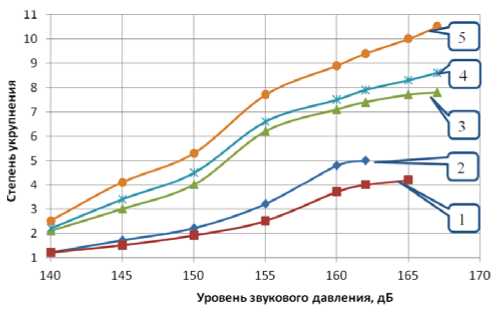 Рис. 10. Зависимости степени укрупнения дисперсных частиц от уровня звукового давления: 1 – продольно-колеблющийся излучатель; 2 – дисковый излучатель; 3 – трубчатый излучатель; 4 – трубчатый+дисковый излучатель; 5 – трубчатый+продольно-колеблющийся излучатель