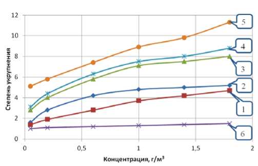 Рис. 11. Зависимости степени укрупнения дисперсных частиц от концентрации: 1 – продольно-колеблющийся излучатель; 2 – дисковый излучатель; 3 – трубчатый излучатель; 4 – трубчатый+дисковый излучатель; 5 – трубчатый+продольно-колеблющийся излучатель; 6 – без УЗ-воздействия