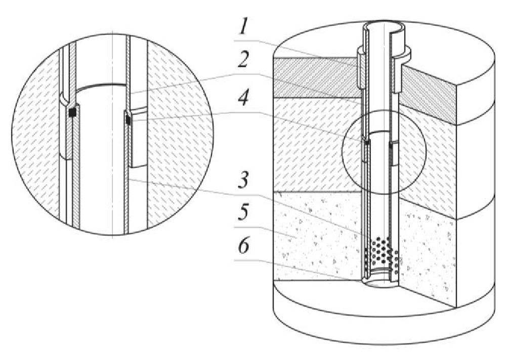 В общем виде водопонижающая скважина состоит из трех основных частей (рис. 1): кондуктора – 1, эксплуатационной – 2 и фильтровой – 3 колонн. В месте соединения колонн для уплотнения устанавливают пакер – 4. Забор жидкости производится из водоносного горизонта – 5. Для сбора механических примесей, находящихся в скважине, предусмотрен отстойник – 6.