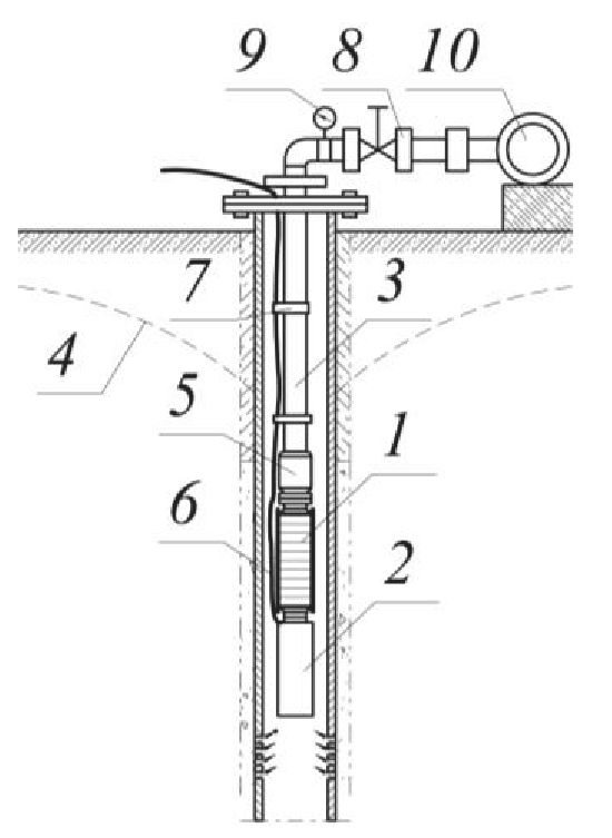 Схема УЭЦН представлена на рис. 2. Электроцентробежный насос (ЭЦН) – 1 с погружным электродвигателем (ПЭД) – 2 подвешивается к колонне насосно-компрессорных труб (НКТ) – 3 ниже динамического уровня воды – 4 в скважине. Непосредственно над насосом или выше устанавливается обратный клапан – 5, предназначенный для предотвращения обратного стока воды в скважину из НКТ. Питание ПЭД осуществляется по кабелю – 6, прикрепленному клямсами – 7 к НКТ. На устье скважины устанавливают задвижку – 8 и манометр – 9. Откачанная жидкость попадает в отводящий трубопровод – 10.