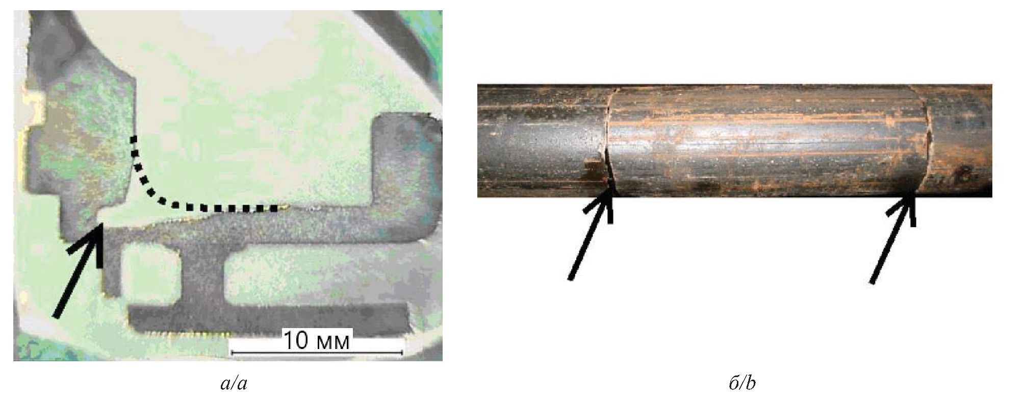 Наиболее опасно изнашивание направляющих аппаратов рабочих ступеней ЭЦН. При этом на стыке верхнего диска и корпуса образуется канавка (рис. 3, а), которая углубляется вплоть до фрагментарного разрушения направляющего аппарата. Дальнейшее развитие гидроабразивного износа ЭЦН нередко приводит к перерезанию корпуса (рис. 3, б) и падению части насоса с ПЭД в скважину, что обусловливает остановку скважины и сопровождается проведением дорогостоящих ремонтных работ [18, 19].