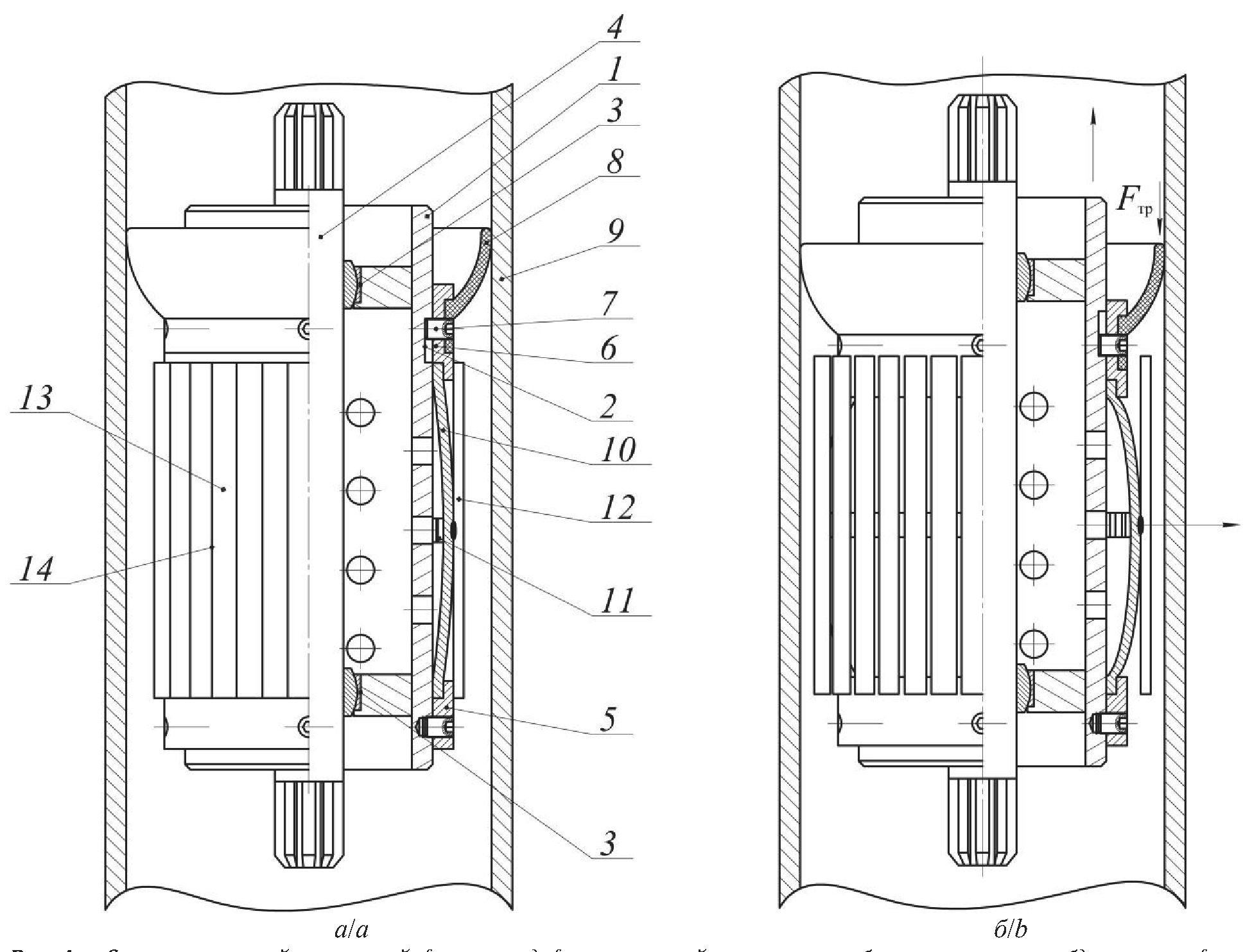 Щелевой входной самоочищающийся фильтр (рис. 4, а) состоит из перфорированной трубы – 1, на поверхности которой выполнены направляющие пазы – 2. В трубе установлены подшипниковые узлы – 3, через которые проходит вал – 4, соединяемый с валами выше- и нижерасположенного оборудования, например, посредством шлицевого соединения через муфты. На конце трубы – 1 посредством установочных винтов закреплен неподвижный упор – 5. На другом конце трубы расположен подвижный упор – 6, перемещающийся в пазах – 2. С помощью установочных винтов – 7 на подвижном упоре – 6 закреплен упругий элемент – 8, который контактирует с внутренней поверхностью обсадной трубы – 9 эксплуатационной колонны и может быть выполнен, например, в виде манжеты. Между неподвижным упором – 5 и подвижным упором – 6 коаксиально трубе – 1 расположен диаметрально расширяемый упругий элемент – 10, выполненный в виде центратора из пружинной стали 60С2ХФА, на котором, в свою очередь, выполнено поперечное крепление – 11, имеющее возможность изменять диаметр при деформации. Коаксиально трубе – 1 расположен фильтрующий элемент – 12, который состоит из продольных вертикальных стержней – 13. Вертикальные продольные стержни – 13 расположены таким образом, что между ними образованы щели – 14 заданного размера.