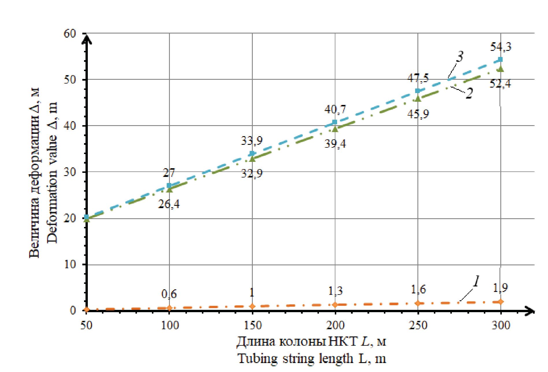 Fig. 7. Graph of the dependence of the deformation value of the tubing string and the tubing extension on the depth of the dewatering well at a wellhead pressure of 1 MPa: 1 – deformation of the tubing column; 2 – deformation of the tubing column extension; 3 – general deformation of the column and the tubing column extension
