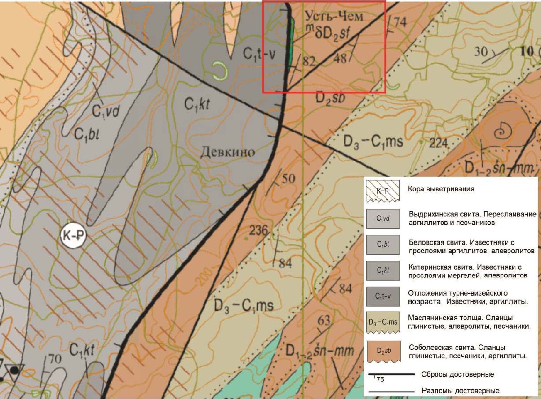 Рис. 1. Фрагмент государственной геологической карты Российской федерации (масштаб 1:200000, лист N-44-XVIII, Черепаново) с указанием участка исследования