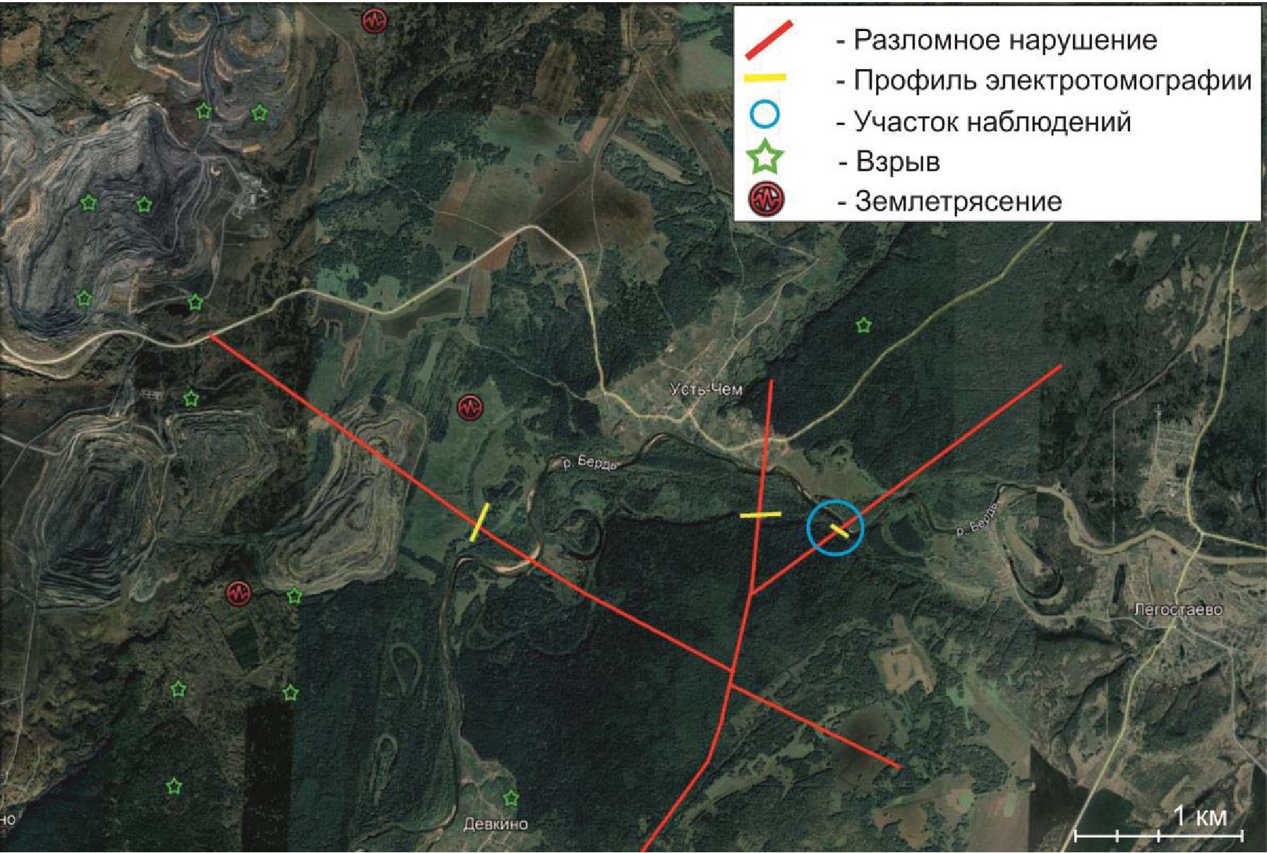 Выбор участка исследования основывался на анализе предшествующих результатов многолетних регулярных наблюдений в сейсмоактивной зоне Горного Алтая. Из анализа получено, что именно в зонах влияния разломов по величине вариаций геоэлектрических параметров можно выделить активные и потенциально сейсмогенерирующие разломы, в области которых может произойти крупное землетрясение [21]. Таким образом, был выбран участок, где по данным методов электроразведки выделена разломная структура, положение которой хорошо согласуется с геологическими данными. Участок исследования находится в районе п. Легостаево Искитимского района Новосибирской области в сейсмоактивной зоне Горловского прогиба, где в последние годы происходят сейсмические события с магнитудой 3–4 и более [22].