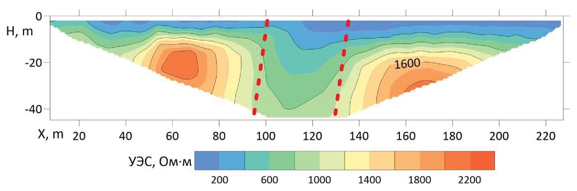 На основе решения обратной задачи в программном комплексе DiInSo получено пространственное распределение удельного электрического сопротивления по профилю измерения. На рис. 3 представлен геоэлектрический разрез, полученный при первом измерении методом ЭТ по профилю мониторинга 26 мая 2023 г. На разрезе в центральной части выделяется наклонная низкоомная зона шириной около 30–35 м, которая по своему положению совпадает с разломом, обоснованным геолого-геофизическими данными. Зону с понижением УЭС ограничивают высокоомные отложения с повышением УЭС более чем в 2 раза. Учитывая большое количество теоретического и экспериментального материала (полевые данные, физическое и численное моделирование), полученного ранее авторами [22, 27], эта низкоомная область на геоэлектрическом разрезе отнесена к проявлению разломного нарушения. Понижение значений УЭС трещиноватой зоны разломного нарушения обусловлены её повышенной водонасыщенностью, что обосновывается данными гидрогеологии. Присутствует подток в водоносные горизонты трещиноватых зон с юго-восточных соседних областей Салаирского кряжа.