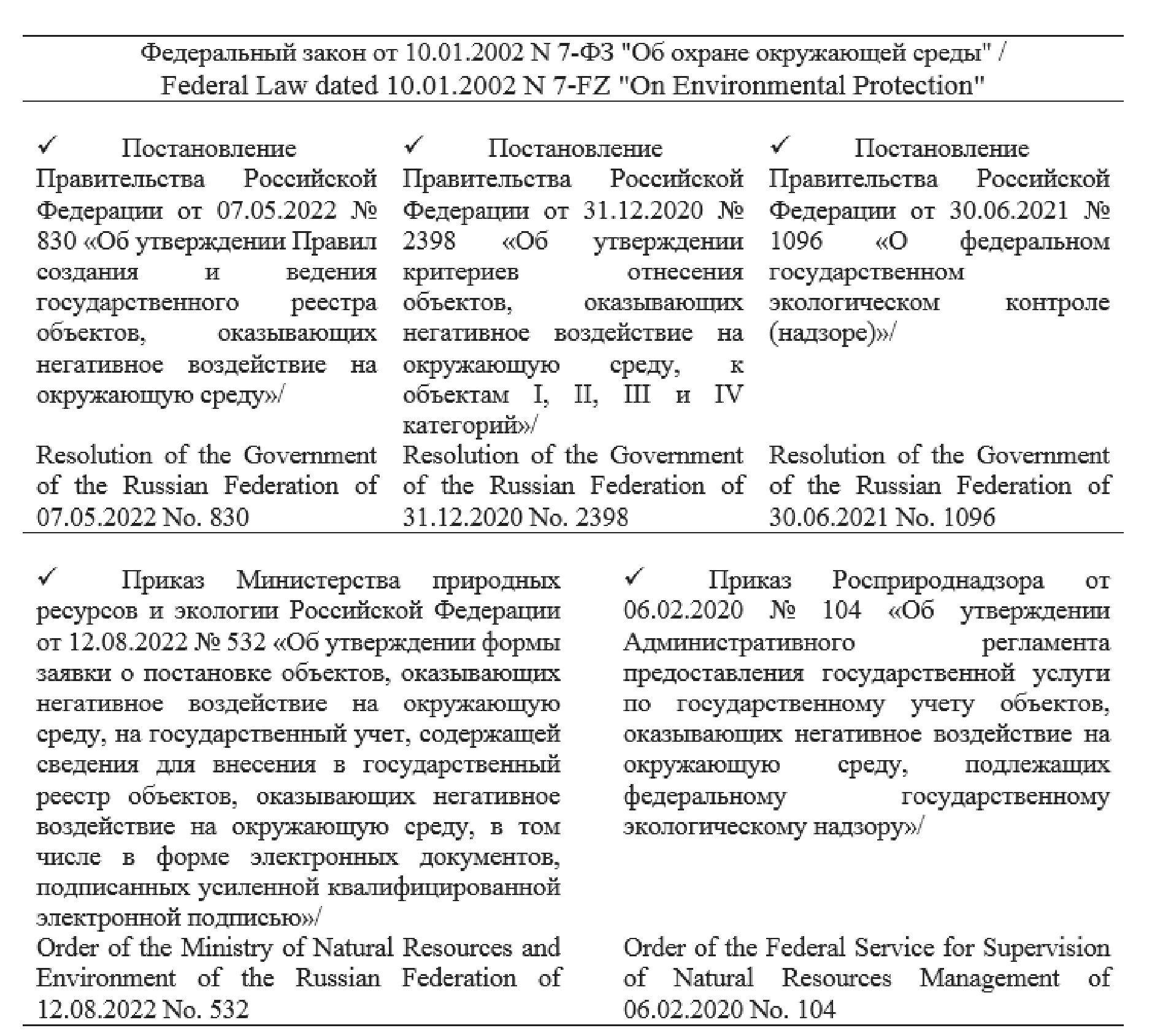 Fig. 2. Regulatory support for management of objects of negative environmental impact in the Russian Federation