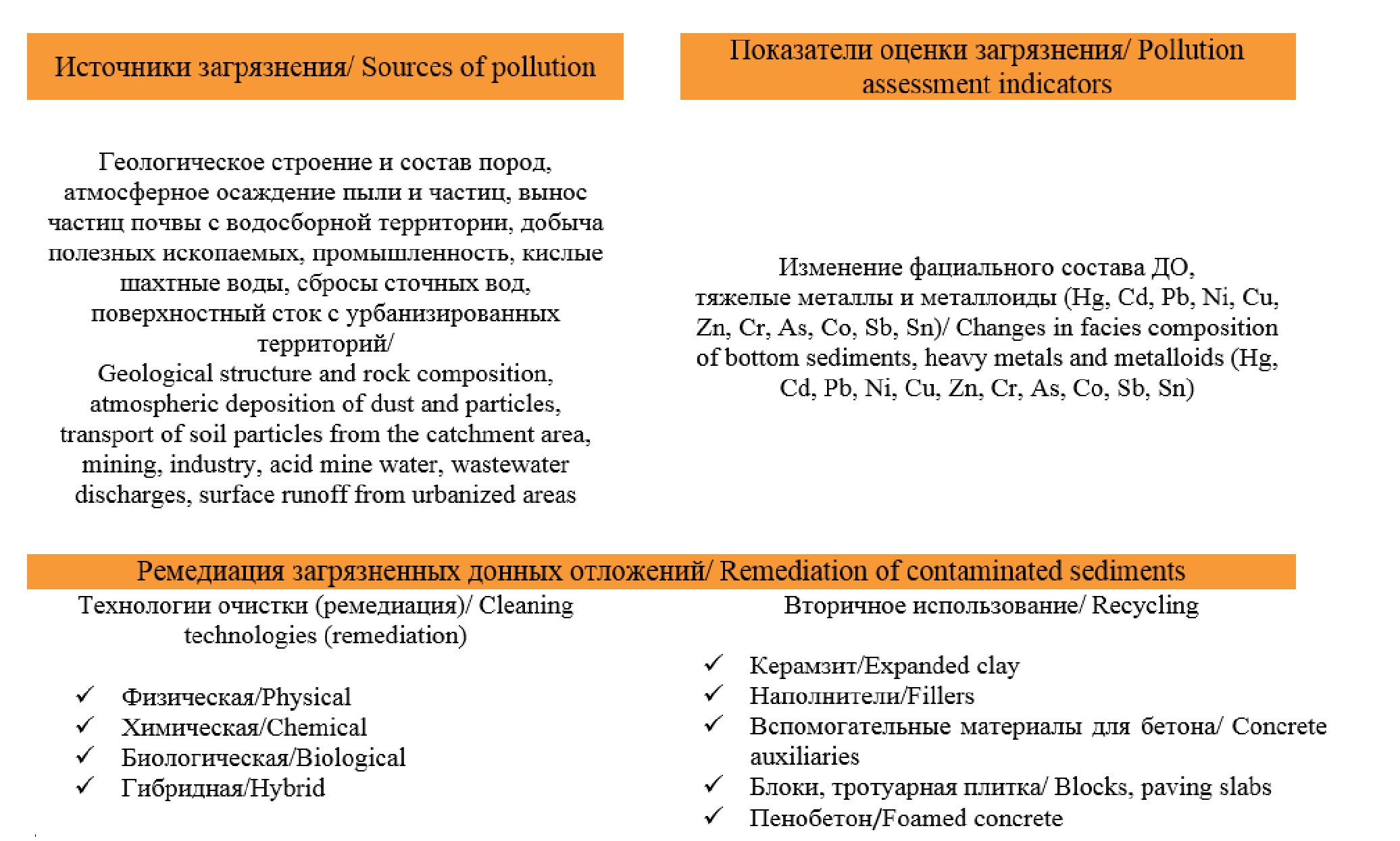 Results and conclusions. The article shows that the most significant transformations in the composition and properties of bottom sediments naturally occur in the conditions of the highest load, typical for historically industrialized and urbanized regions. The authors have carried out a review of regulatory support for the assessment and remediation of contaminated bottom sediments. The paper highlights the gaps in the existing regulatory framework applied in Russia related to the lack of requirements for safe concentrations of toxic metals in bottom sediments. Systematization and analysis of applied technologies for bottom sediments remediation are carried out. The main directions of such works include application of physical, physico-chemical, chemical and biological methods of bottom sediments remediation and purification. These methods can be implemented either in situ or ex situ. The advantage of the first option is the lower cost of the works, while the remediation of sediments outside the water body allows achieving a higher degree of purification from heavy metals. The review shown the prospect of using hybrid remediation technologies with the selection of a set of methods that meet the requirements for treatment efficiency and economic feasibility, as well as the possibility of using contaminated sludge for the production of marketable products.