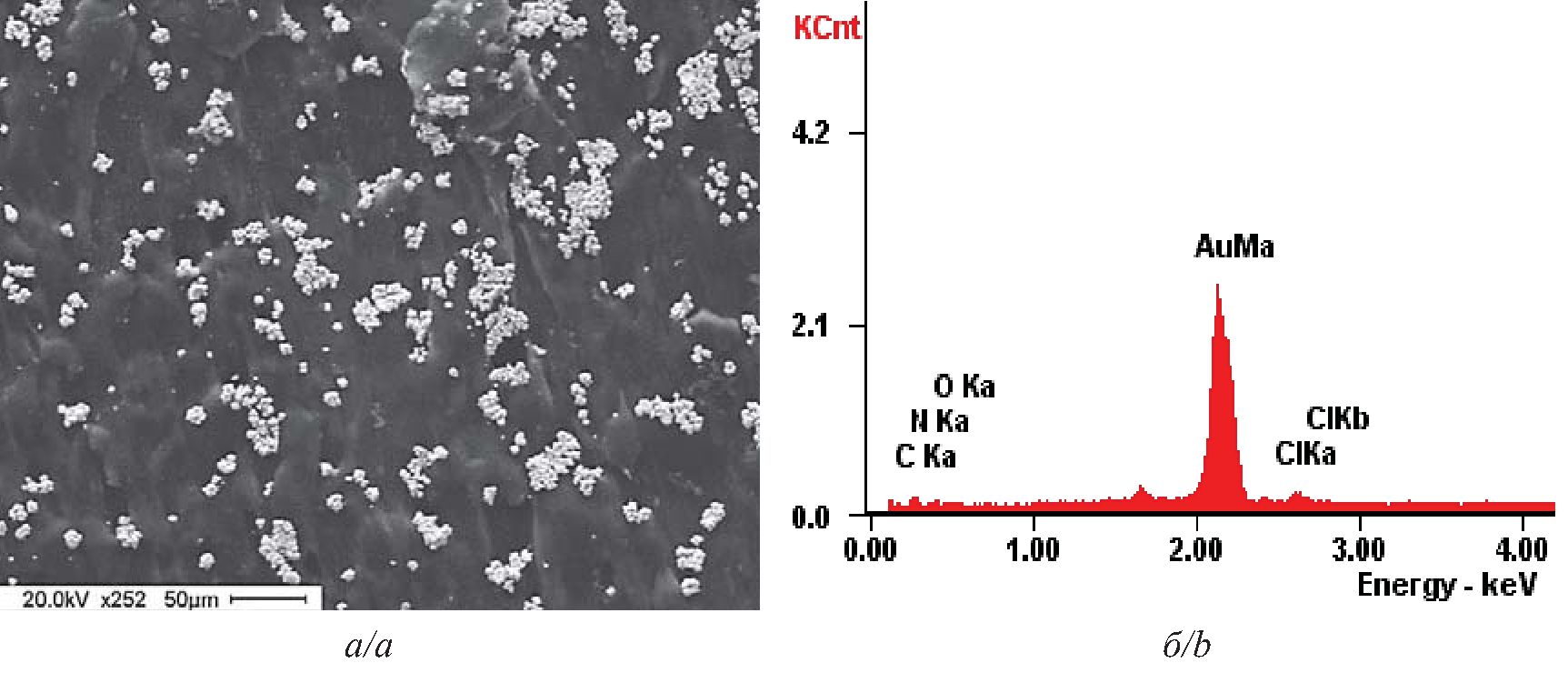 Модифицирование композитного полимер-углеродного электрода (КПУЭ) приводит к формированию на его поверхности частиц золота в виде агрегатов размерами 5…10 мкм, сгруппированных в скопления размерами до 50 мкм, относительно равномерно распределенные по поверхности композитной подложки (рис. 1, а). Размеры отдельных частиц в наблюдаемых агрегатах соответствуют субмикронному диапазону. Результаты рентгеноспектрального микроанализа модифицированного электрода КПУЭ-Au подтверждают присутствие частиц золота на его поверхности (рис. 1, б).