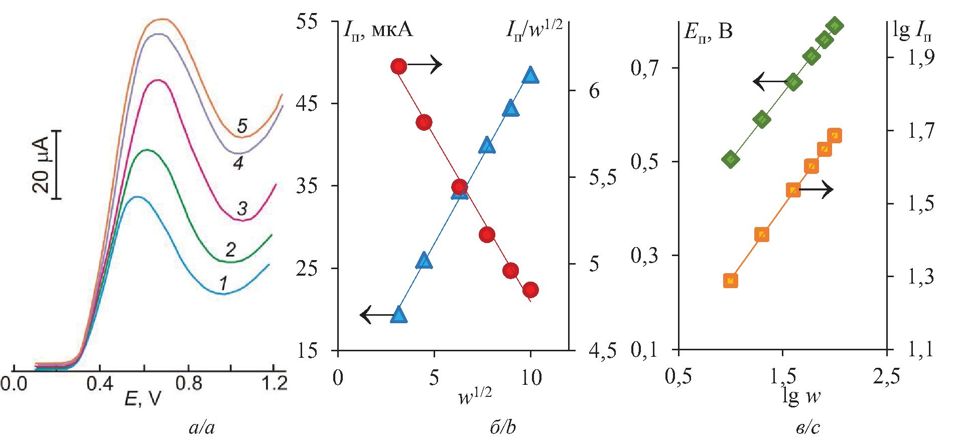 С целью установления влияния условий регистрации вольтамперограмм на параметры электродного процесса было изучено влияние скорости развертки потенциалов на величины Iп и Еп пика анодного окисления гидразина (рис. 5, а). Линейная зависимость величины пика тока Iп от квадратного корня из скорости развертки потенциала Iп=f(w1/2) свидетельствует о замедленной диффузии деполяризатора к поверхности электрода (рис. 5, б). Убывающая зависимость отношения Iп/w1/2 от скорости развертки (рис. 5, б) свидетельствует о наличии химической реакции, протекающей совместно со стадией разряда, что согласуется с уменьшением кажущегося порядка электродной реакции по гидразину, зафиксированным в растворах с относительно высокой концентрацией соли гидразина. Зависимость потенциала пика анодного окисления Еп от концентрации соли гидразина (рис. 4, а), а также линейные зависимости Еп и lgIп от логарифма скорости развертки свидетельствуют о необратимости процесса окисления гидразина (рис. 5, а, в). Таким образом, использование растворов с концентрацией соли гидразина, превышающей ~1,5×10–3 М, нецелесообразно в условиях вольтамперометрического метода определения вследствие усиления влияния побочной химической реакции на величину аналитического сигнала.