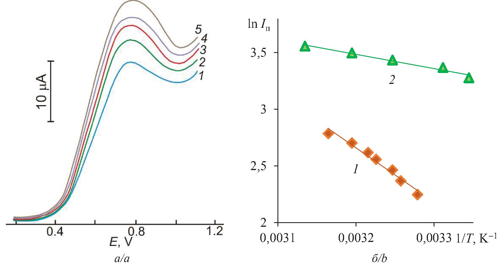 Рис. 6. Анодные вольтамперограммы (а) композитного полимер-углеродного электрода, модифицированного частицами золота, в растворе 6∙10–4 М N2H4×H2SO4+0,1 М KNO3 при различных температурах: 1) 26, 2) 29, 3) 35, 4) 40, 5) 46 °С, и (б) зависимости логарифма пика тока от обратной температуры для концентрационных диапазонов 1) 1·10–5…1·10–4 and 2) 1·10–4…1.5·10–3 М N2H4×H2SO4 (w=50 мВ/с; деаэрирование растворов азотом)