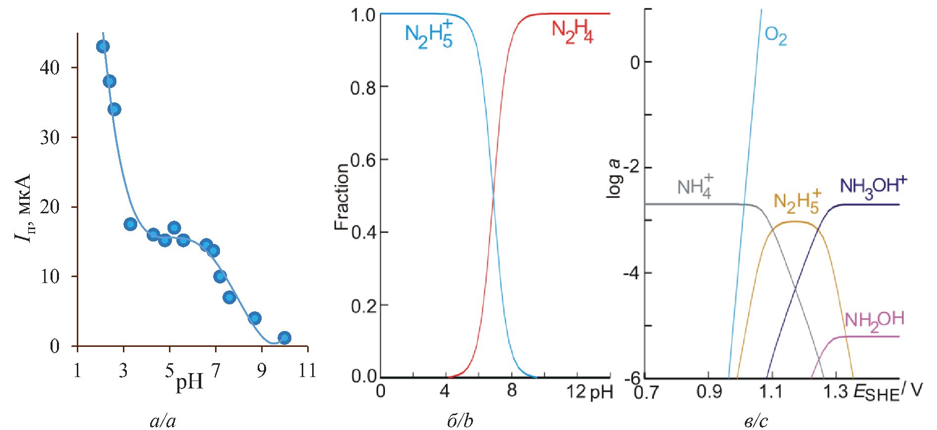 Важным обстоятельством с точки зрения интерпретации анодного пика на вольтамперной кривой является возможность присутствия гидразина в растворах в виде двух равновесных ионно-молекулярных форм N2H4 и N2H5+ в зависимости от рН раствора. Для установления зависимости величины аналитического сигнала от соотношения этих форм в растворах была проведена регистрация вольтамперограмм в растворе 4∙10–4 М N2H4×H2SO4 в диапазоне рН=2…10. Из данных вольтамперометрии следует, что величина анодного тока Iп зависит от рН немонотонно: в интервале рН 7…10 величина анодного тока уменьшается практически до фоновых значений; в интервале рН=3…7 ток практически не зависит от рН; в кислой среде с рН<3 анодный ток резко возрастает (рис. 7, а). Оценку соответствия данных вольтамперометрии содержанию той или иной формы гидразина в растворе проводили путем расчета равновесных активностей этих форм с использованием системы уравнений: