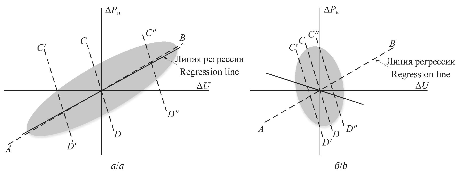 Из-за значительного влияния реакции сети на рис. 1, б эллипс рассеивания изменяется таким образом, что ЛР перестаёт совпадать с линейной СХН AB. Из этого следует, что учёт реакции сети предполагает более сложную статистическую обработку, чем простое построение ЛР [4, 14, 15]. Обычно обработка сводится к усреднению телеметрии, относящейся к разным условиям электроснабжения, соответствующим линиям CD, C'D' и C''D'' [4].
