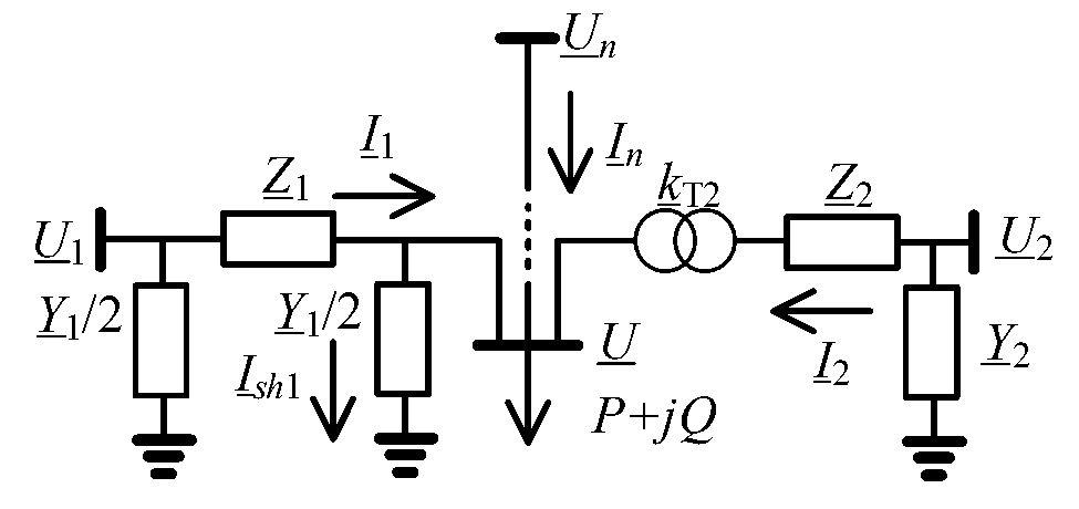где знак * – комплексное сопряжение; – коэффициент трансформации i-й связи по напряжению при переходе со стороны начала i-й связи на сторону узла нагрузки (для линии ); – коэффициент трансформации i-й связи по току при переходе со стороны начала i-й связи на сторону узла нагрузки (для линии ); Zi=Ri+jXi – комплексное сопротивление i-й связи c питающим узлом, приведённое к номинальному напряжению узла нагрузки; Yi=Gi+jBi – комплексная проводимость на землю i-й связи с питающим узлом, примыкающая к узлу нагрузки и приведённая к номинальному напряжению узла нагрузки.