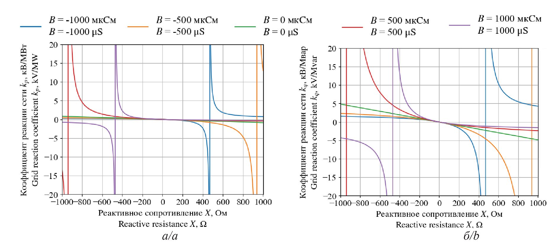 - При B>0 (индуктивная проводимость) точки разрыва для коэффициентов kP и kQ смещаются в область отрицательных значений X. Так как большинство сетевых элементов, питающих узел нагрузки, обладают положительным реактивным сопротивлением [23], далее область значений X<0 исключается из рассмотрения.
