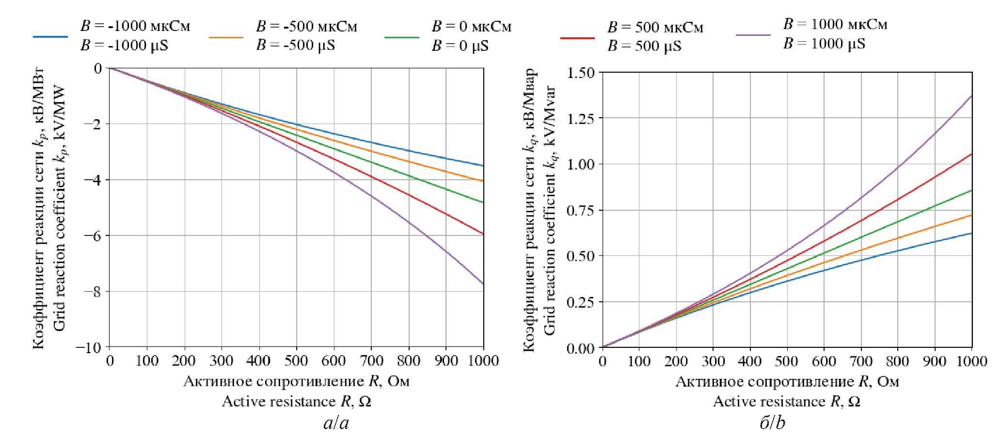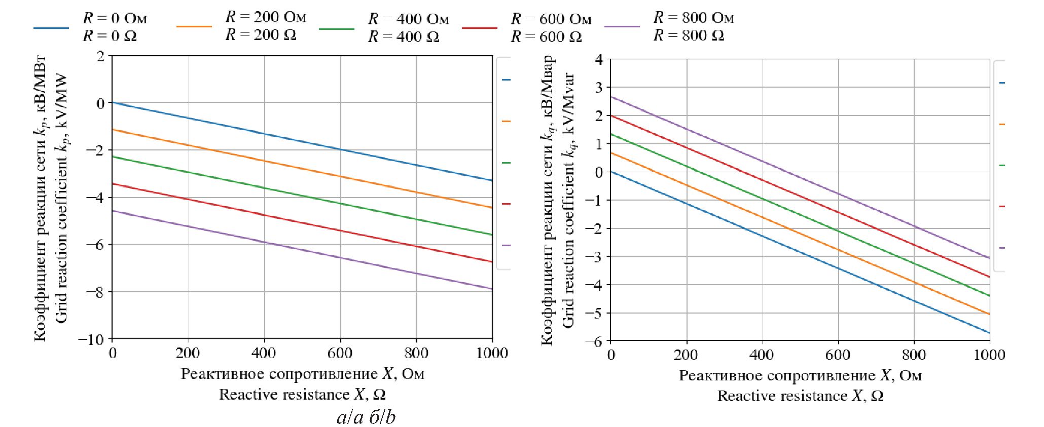 При любом значении G значения kP и kQ убывают с увеличением X. При этом большее значение G соответствует меньшим по модулю значениям kP и kQ. Как и в случае c реактивной проводимостью значения kQ больше по модулю соответствующих значений kP.