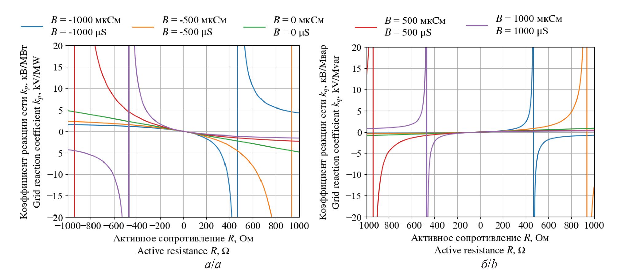 - При B<0 (ёмкостная проводимость) точки разрыва для коэффициентов kP и kQ смещаются в область положительных значений X.