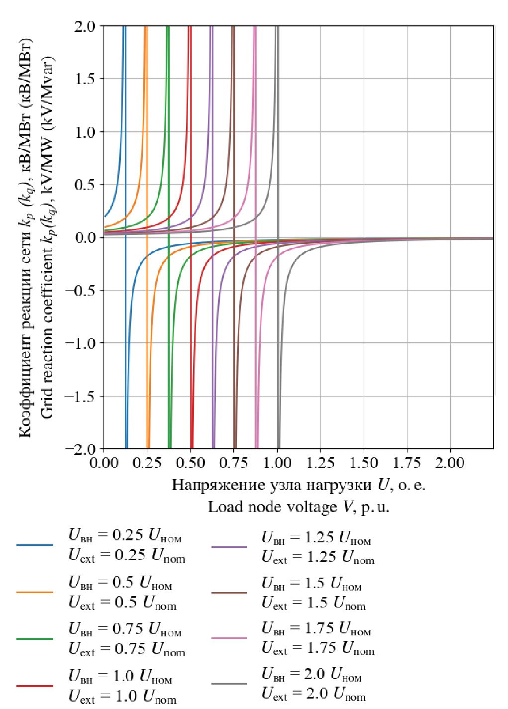 При некотором граничном значении напряжения узла нагрузки Uгр≈0,5 Uвн наблюдается точка разрыва функций kP(U) и kQ(U). Данное значение напряжения соответствует границе по статической апериодической устойчивости связи, осуществляющей питание узла нагрузки.