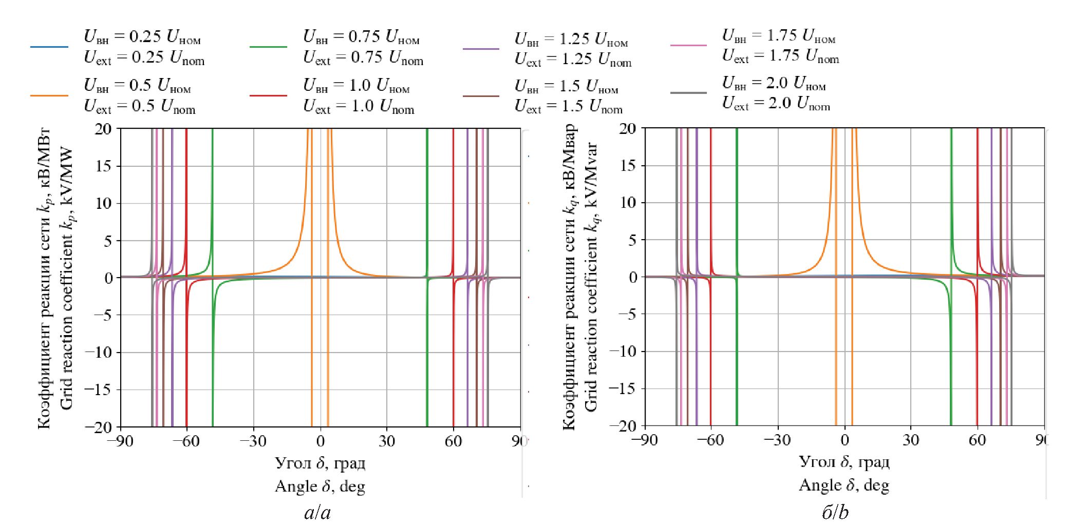 На рис. 9, а, б приведены графики зависимостей kP(δвн–δ) и kQ(δвн–δ) при различных значениях модуля рабочего напряжения U узла нагрузки и Uвн=1 o. e.