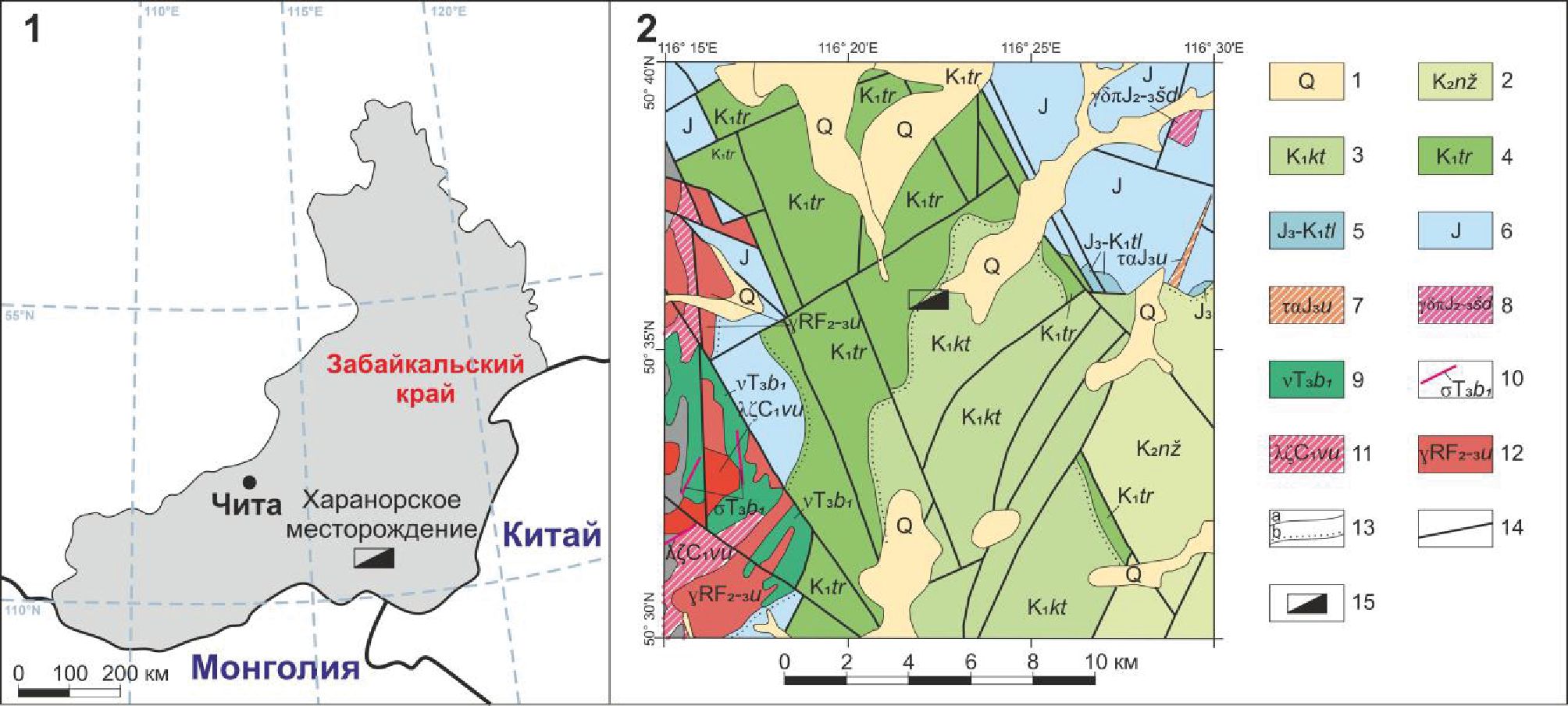Рис. 1. Расположение Харанорского угольного месторождения (1, 2); фрагмент геологической карты [11] (2). Условные обозначения: 1 – четвертичные отложения; 2–4 – меловые отложения: 2 – ножийская свита, 3 – кутинская свита, 4 – тургинская свита; 5 – верхняя юра – нижний мел: тулукуйская свита; 6 – юрские отложения; 7 – ундинодаинский комплекс трахибазальт-риодацитовый; 8 – шадоронский комплекс андезит-дацитовый; 9, 10 – береинский комплекс габбро-плагиогранитовый: 9 – первая фаза. Долериты, габбро-диориты, габбро, 10 – дайки перидотитов; 11 – верхнеуртуйский комлекс базальт-дацитовый; 12 – урулюнгуйский комплекс гранитовый; 13 – геологические границы: a – достоверные, b – несогласного залегания; 14 – разрывные нарушения; 15 – Харанорское месторождение