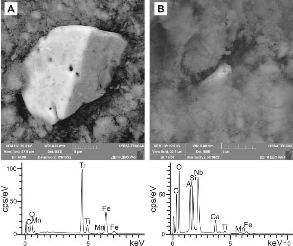 Также в тонштейне обнаружена минеральная Nb-содержащая фаза, по составу близкая к группе пирохлора (рис. 4, B). Диагностируются фосфаты легких и тяжелых РЗЭ. Легкие РЗЭ представлены монацитом, преимущественно монацитом-(Ce). В ряде фаз наблюдается примесь тория. Тяжелые РЗЭ представлены ксенотимом-(Y). Ксенотим встречается как в виде отдельных фаз, так и в виде микровключений на поверхности цирконов. На зерне, состоящем из TiO2 (рис. 5, A), сформировался агрегат, состоящий из монацита-(Ce) (рис. 5, B).