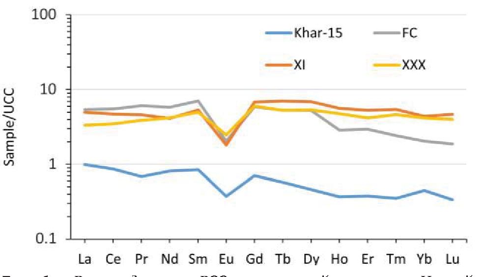 Рис. 6. Распределение РЗЭ в тонштейне пласта Новый-1а (Khar-15), в тонштейне Fire Clay (FC), в прослое пласта XI Кузбасс (XI) и в партинге пластов XXX–XXXa в Минусинском бассейне (XXX). Нормировано на кларк в верхней континентальной земной коре [22]