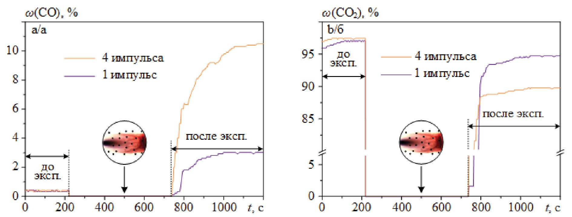 Fig. 1. Curves of changes in the content of CO (a) and СО2 (b) in the working chamber before and after experiments in single pulse and multi-pulse operation mode