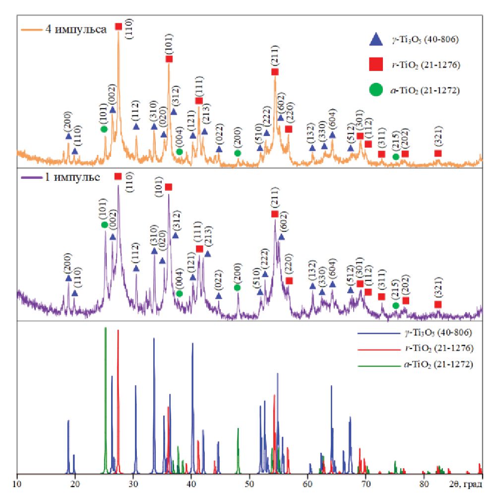 Результаты оценочного количественного анализа фазового состава продуктов синтеза приведены в табл. 3. Продукты синтеза характеризуются существенным содержанием устойчивой кристаллической модификации TiO2, причем в большей степени в форме рутила. Его содержание может доходить до почти 60 % при использовании многоимпульсного режима. В одноимпульсном режиме оказывается возможным снижение содержания рутила до 38 % с одновременным повышением общего выхода Магнели-фаз до 52 %.