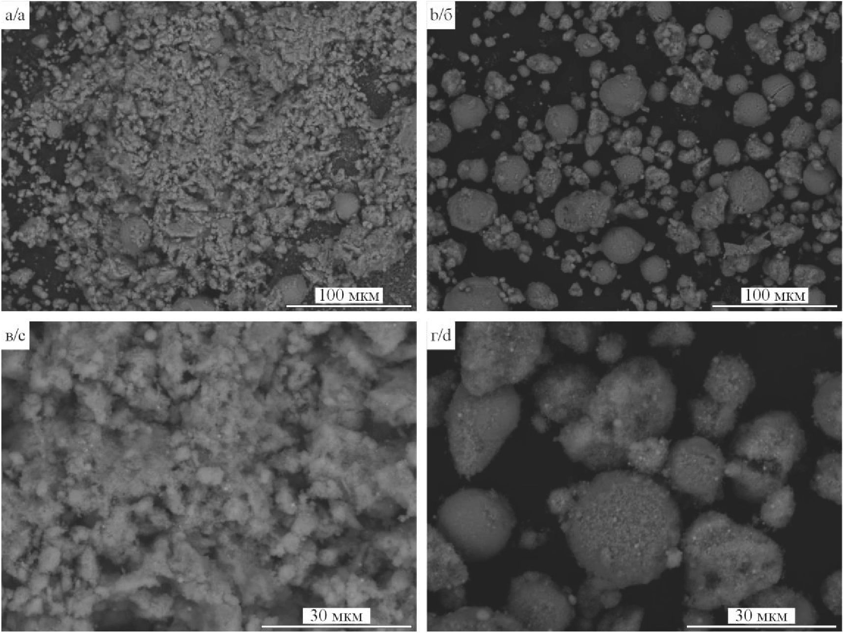 Рис. 3.Результаты сканирующей электронной микроскопии продуктов, синтезированных в одноимпульсном (а, в) и многоимпульсном (б, г) режимах