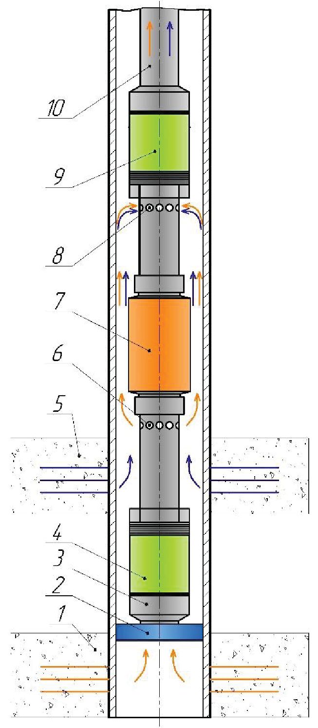 Fig. 1. Layout scheme for joint-separate exploitation of two oil reservoirs: 1 – lower formation in the sub-packer space; 2 – lower packer; 3 – liner; 4 – electric submersible pump-1 (ESP-1); 5 – upper formation in the above-packer space; 6 – discharge holes; 7 – double-sided submersible electric motor (SEM); 8 – receiving holes; 9 – electric submersible pump-2 (ESP-2); 10 – tubing