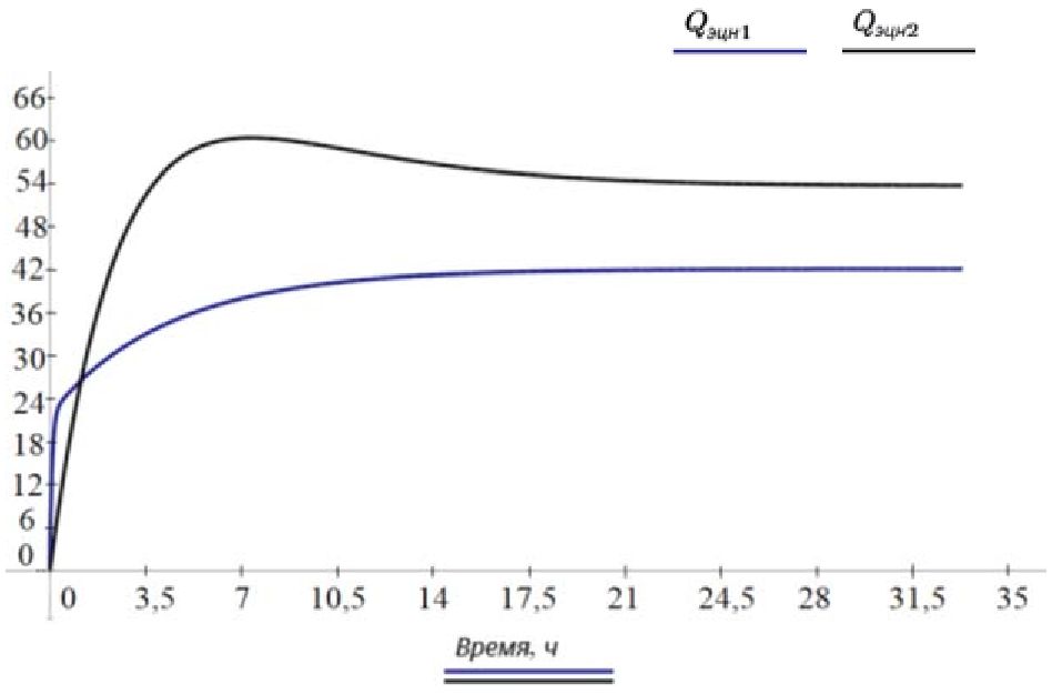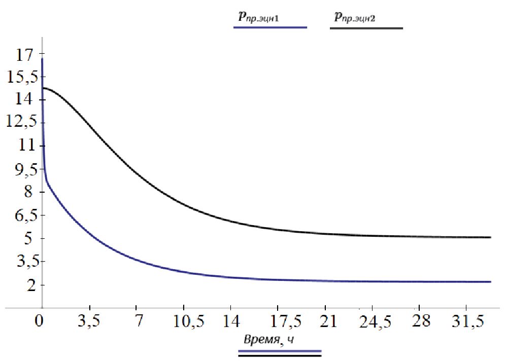 Исходя из полученных зависимостей видно, что давление на приеме ЭЦН-1 снижается с начального значения 16,5 до 2,5 МПа, а давление на приеме ЭЦН-2 снижается с начального значения 15 до 5,7 МПа. Соответственно режим стабилизации давлений на приеме ЭЦН-1 и ЭЦН-2 составляет 21 час. Развиваемая насосами депрессия на каждый конкретный пласт позволяет достичь оптимального баланса между притоком жидкости из пласта и оттоком жидкости в ЭЦН-1 и ЭЦН-2.