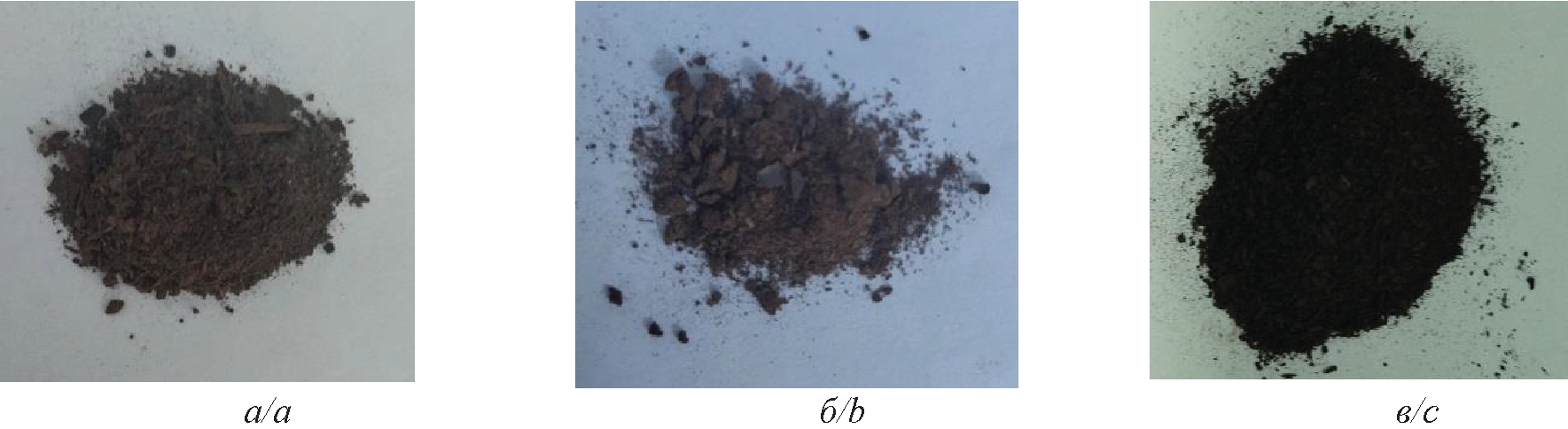 Рис. 1. Активированные сорбенты: а) гидроуголь (акт. H2O2); б) гидроуголь (акт. H2O2+H2SO4); в) гидроуголь (пар.‑газ. акт. 250 °С, 2 ч)